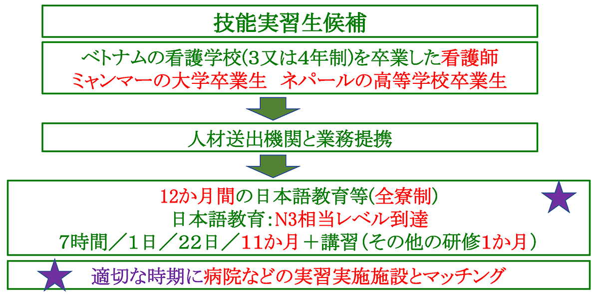 - ベトナムの医療系大学看護学科、看護短期大学(いずれも3年生)の卒業者ミャンマーの大学卒業者、ネパールの高等学校卒業者